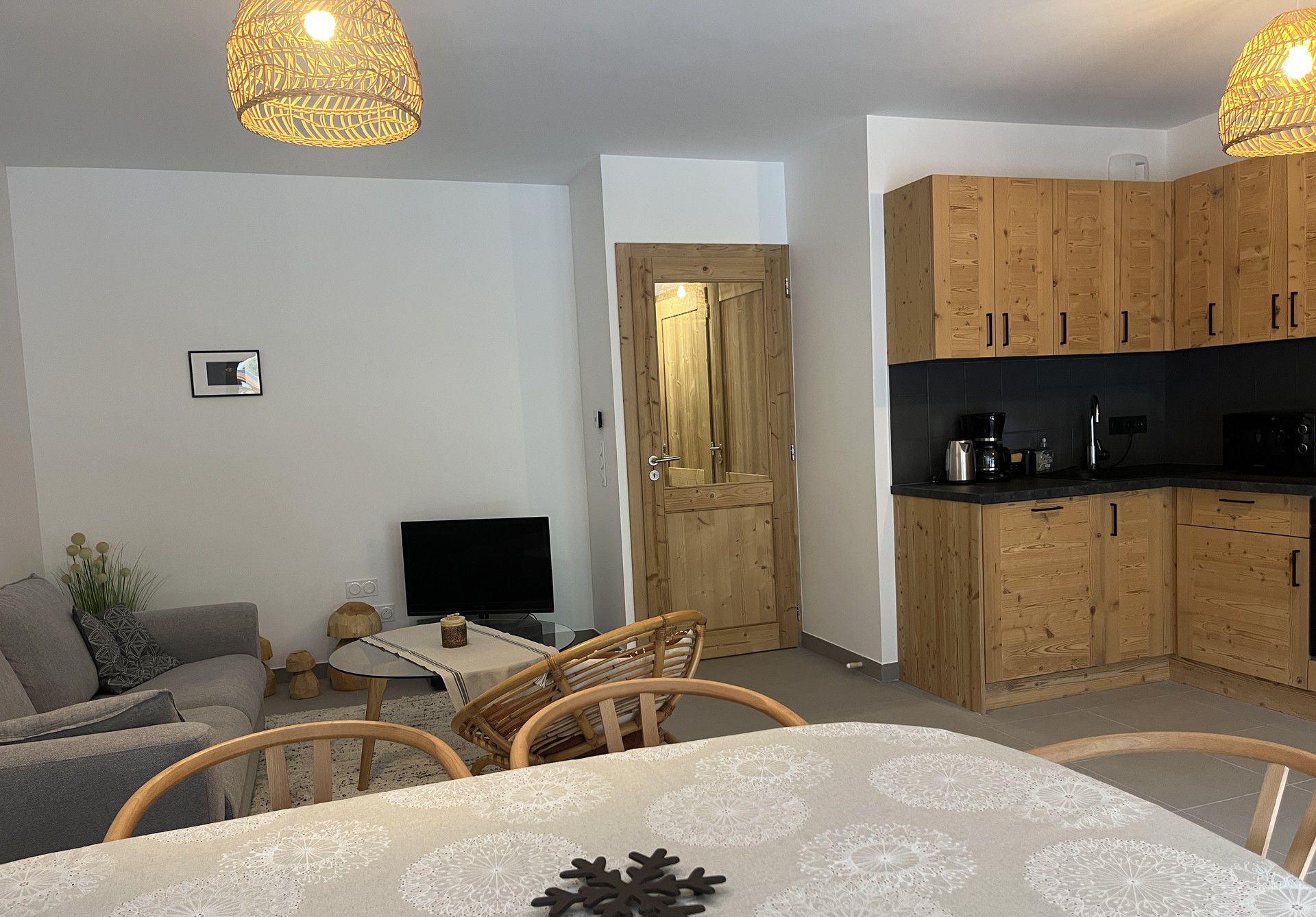 Séjour/cuisine (four, micro-ondes, frigo, lave-vaisselle, plaque induction) canapé lit en 140 cm, télévision.
