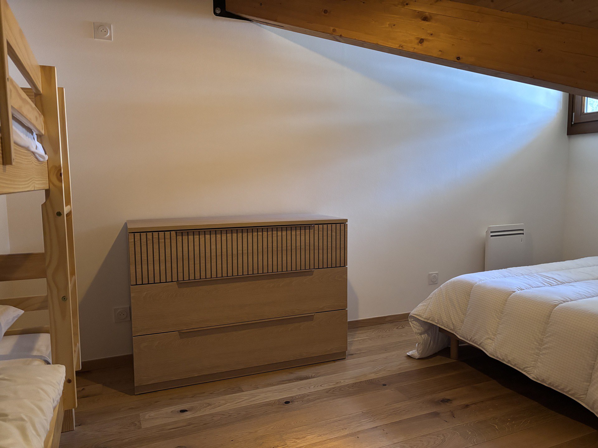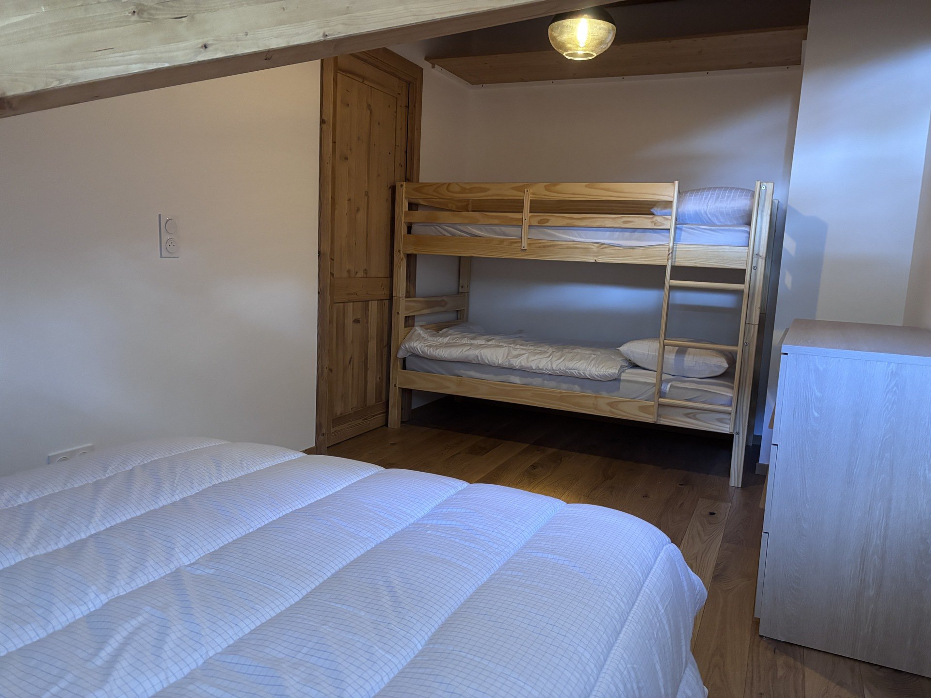 Chambre avec un lit 2 places en 140 cm + lit superposés en 90 cm.