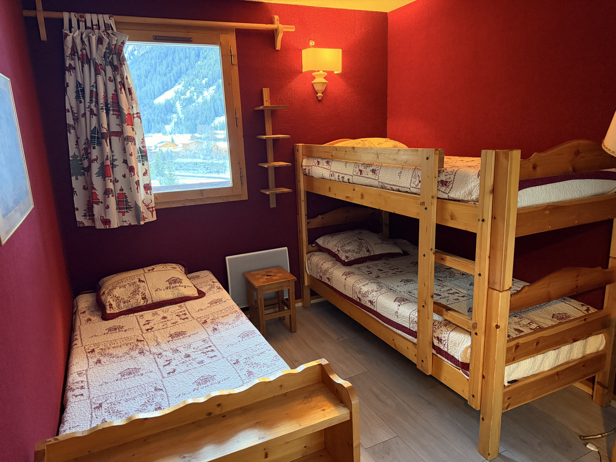 Une seconde chambre avec lits superposés et un lit simple, placard
