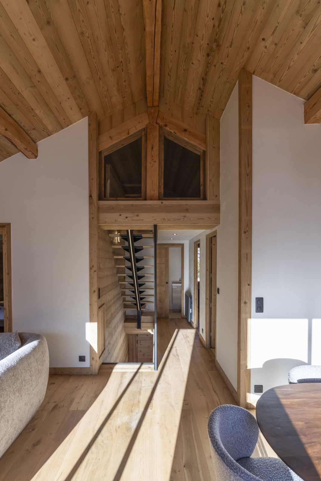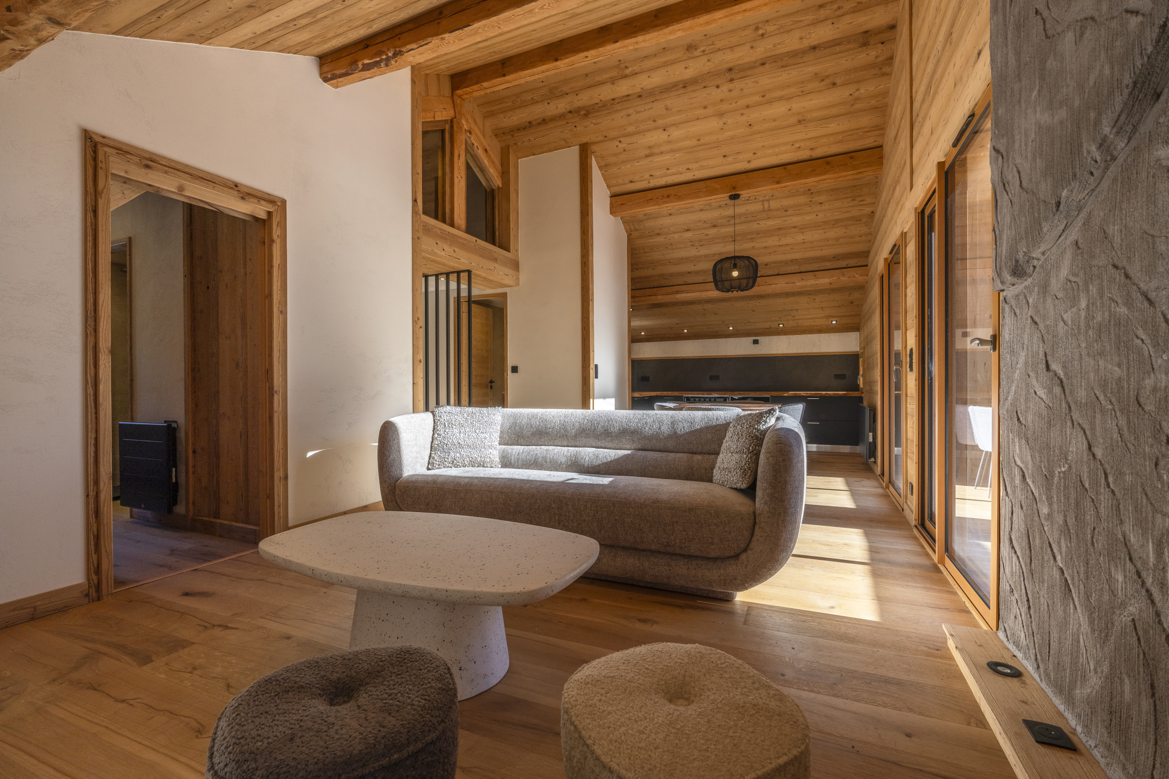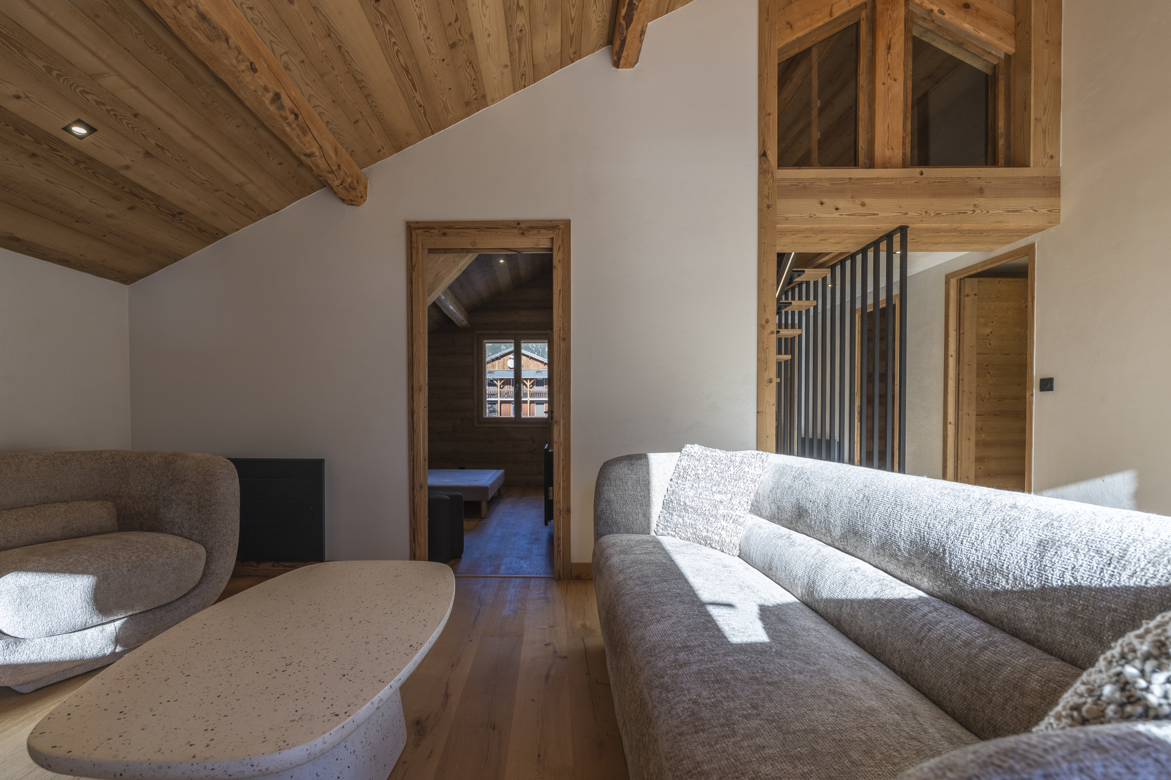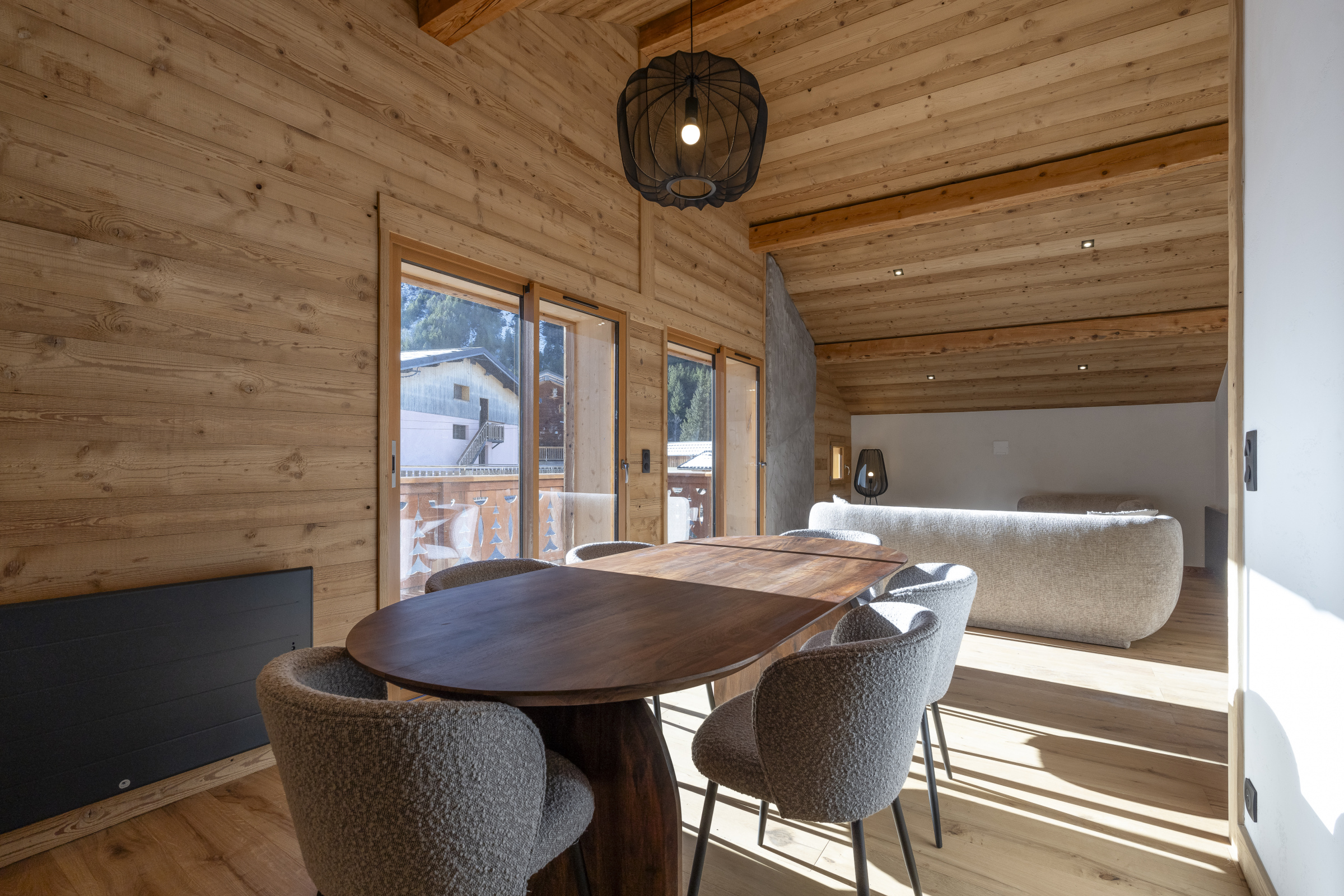 Au cœur du village, dans un chalet savoyard authentique entièrement rénové et divisé en deux logements seulement, découvrez ce superbe appartement T3 avec coin montagne en mezzanine.